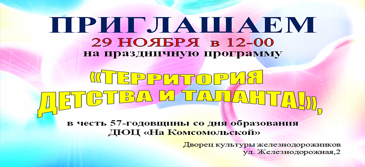 Приглашаем 29 ноября  на праздничную программу "Территория детства и талантов", посвященную 57-й годовщине со дня основания Детско-юношеского центра  «На Комсомольской»! Вас ждет яркая программа, наполненная т...